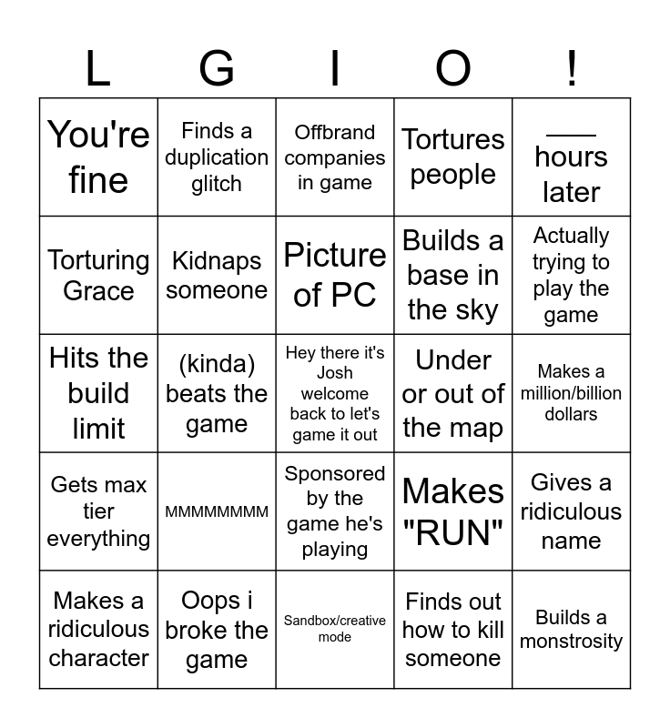 This bingo card has a free space and 24 words: MMMMMMMM, Oops i broke the game, Picture of PC, Makes a ridiculous character, ___ hours later, You're fine, Torturing Grace, Finds a duplication glitch, Under or out of the map, Sponsored by the game he's playing, Builds a base in the sky, Hits the build limit, Makes "RUN", Gives a ridiculous name, Kidnaps someone, Finds out how to kill someone, Makes a million/billion dollars, Offbrand companies in game, Actually trying to play the game, (kinda) beats the game, Builds a monstrosity, Gets max tier everything, Tortures people and Sandbox/creative mode.