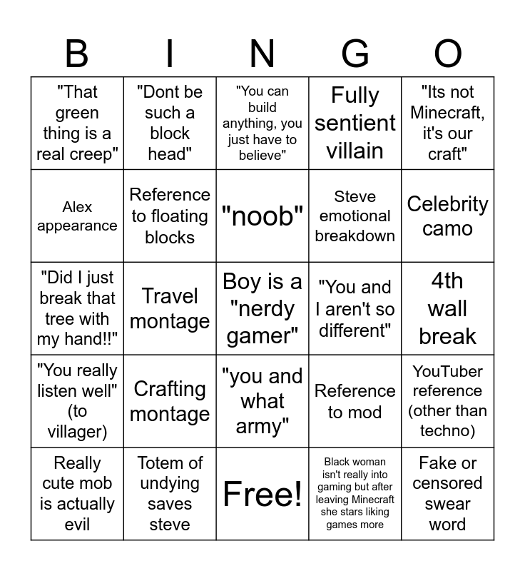 This bingo card has 25 words: "You really listen well" (to villager), Totem of undying saves steve, Boy is a "nerdy gamer", Black woman isn't really into gaming but after leaving Minecraft she stars liking games more, "Its not Minecraft, it's our craft", "That green thing is a real creep", "Dont be such a block head", "You can build anything, you just have to believe", "You and I aren't so different", YouTuber reference (other than techno), Alex appearance, Reference to floating blocks, Free!, Reference to mod, Celebrity camo, Really cute mob is actually evil, Travel montage, "noob", Steve emotional breakdown, 4th wall break, "Did I just break that tree with my hand!!", Crafting montage, "you and what army", Fully sentient villain and Fake or censored swear word.