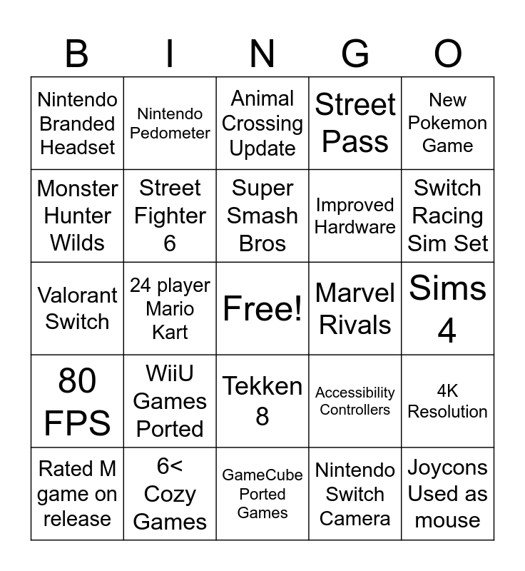 This bingo card has a free space and 24 words: WiiU Games Ported, 6< Cozy Games, Super Smash Bros, Rated M game on release, New Pokemon Game, Nintendo Branded Headset, Monster Hunter Wilds, Nintendo Pedometer, Marvel Rivals, Tekken 8, Improved Hardware, Valorant Switch, Accessibility Controllers, 4K Resolution, Street Fighter 6, Nintendo Switch Camera, Sims 4, Animal Crossing Update, Switch Racing Sim Set, 24 player Mario Kart, Joycons Used as mouse, 80 FPS, Street Pass and GameCube Ported Games.