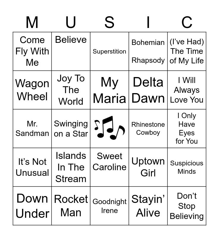 This bingo card has a free space and 44 words: Beat It, Don’t Stop Believing, Girls Just Want to Have Fun, Down Under, Jump, Stayin’ Alive, Superstition, Dreams, (I’ve Had) The Time of My Life, Rocket Man, Bohemian Rhapsody, Rhinestone Cowboy, Sweet Caroline, Islands In The Stream, Dancing Queen, Goodnight Irene, Unforgettable, Mr. Sandman, YMCA, I Will Always Love You, Believe, Have You Ever Seen The Rain, Sound of Silence, Come Fly With Me, Fever, I Only Have Eyes for You, Abra-cadabra, Crocodile Rock, Uptown Girl, It’s Not Unusual, You Sexy Thing, Suspicious Minds, Shake Rattle & Roll, Smile, Swinging on a Star, Honky Tonk Blues, Bad Bad Leroy Brown, If I Die Young, My Maria, Wagon Wheel, Delta Dawn, Your Cheatin’ Heart, Joy To The World and Chattanooga Choo Choo.