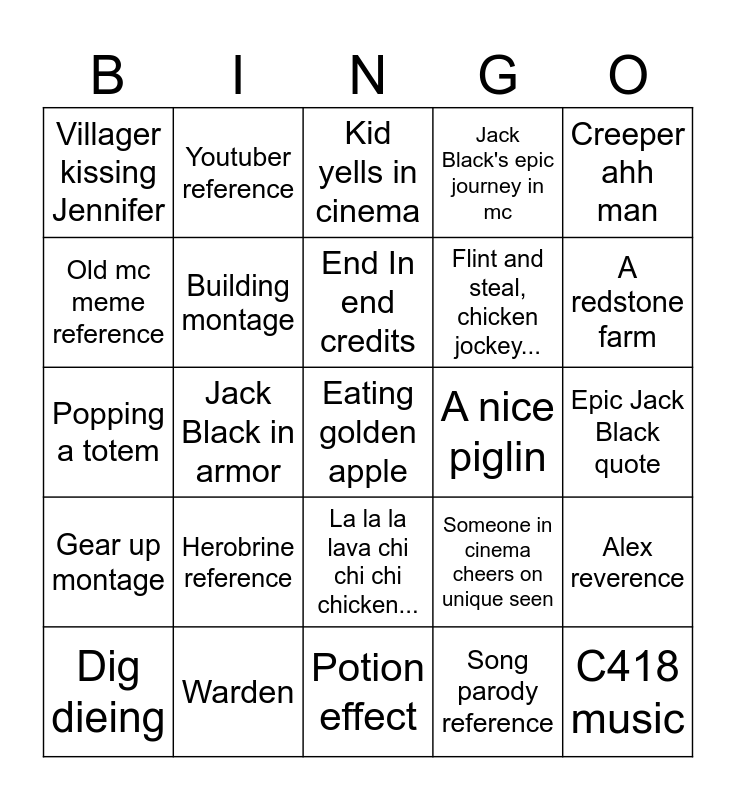 This bingo card has 25 words: Herobrine reference, Potion effect, End In end credits, Dig dieing, Creeper ahh man, Villager kissing Jennifer, Old mc meme reference, Youtuber reference, A nice piglin, La la la lava chi chi chi chicken..., Flint and steal, chicken jockey..., Popping a totem, Someone in cinema cheers on unique seen, Alex reverence, Building montage, C418 music, Epic Jack Black quote, Kid yells in cinema, A redstone farm, Jack Black in armor, Eating golden apple, Warden, Gear up montage, Jack Black's epic journey in mc and Song parody reference.