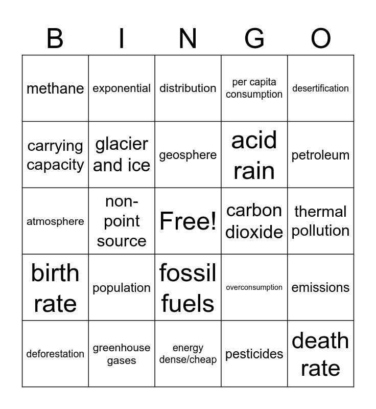This bingo card has a free space and 35 words: natural resource, renewable resource, nonrenewable resource, glacier and ice, fossil fuels, per capita consumption, carrying capacity, migration, geosphere, biosphere, atmosphere, desertification, hydrosphere, point source, methane, carbon dioxide, pesticides, non-point source, birth rate, death rate, overconsumption, deforestation, emissions, greenhouse gases, distribution, petroleum, desalination, ozone, acid rain, thermal pollution, wildfires/volcanos, energy dense/cheap, population, exponential and limited resources.