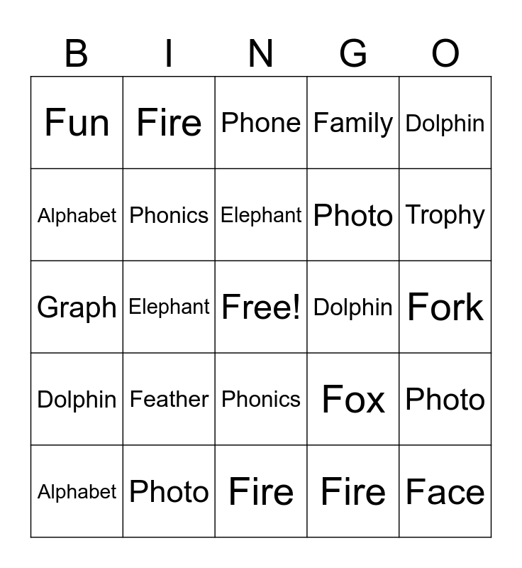 This bingo card has a free space and 66 words: phone, trophy, Phone, Photo, Fish, Dolphin, Fire, Trophy, Elephant, Fan, Phonics, Graph, Fork, Dolphin, Fox, Alphabet, Elephant, Fun, Phone, Photo, Feather, Dolphin, Family, Trophy, Farm, Graph, Fish, Phonics, Face, Phone, Alphabet, Elephant, Five, Dolphin, Fox, Photo, Friend, Graph, Fire, Trophy, Phonics, Elephant, Dolphin, Fan, Phone, Alphabet, Trophy, Feather, Fox, Photo, Elephant, Dolphin, Farm, Graph, Phonics, Fish, Face, Trophy, Phone, Fire, Fish, Fox, Alphabet, Dolphin, Graph and Feather.