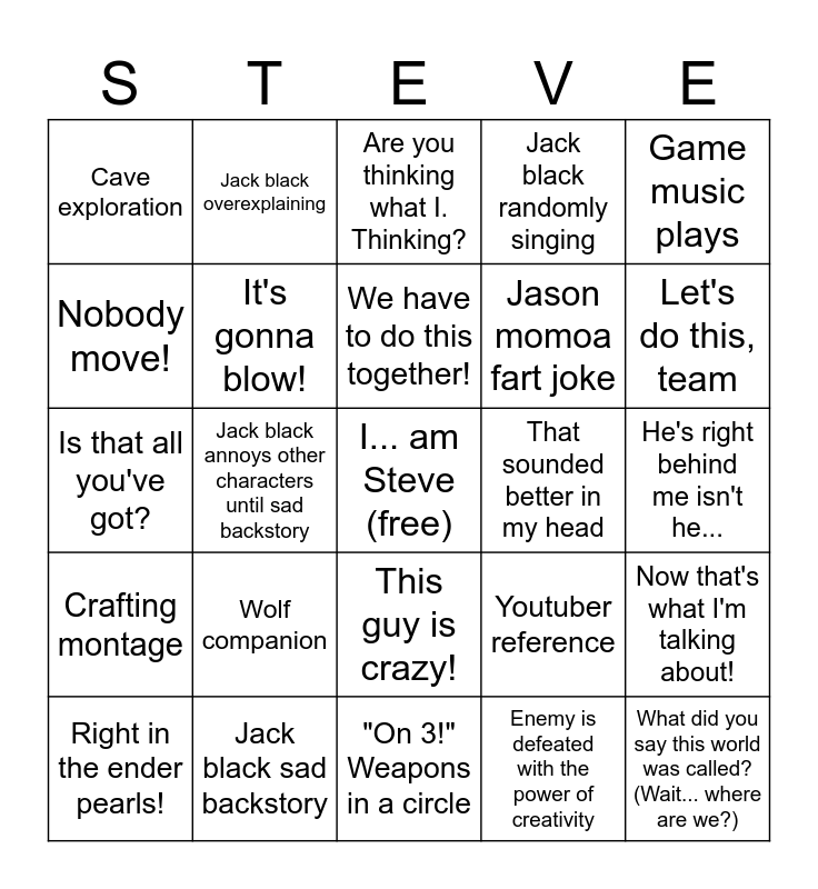 This bingo card has a free space and 24 words: Wolf companion, Jack black sad backstory, We have to do this together!, Right in the ender pearls!, Game music plays, Cave exploration, Nobody move!, Jack black overexplaining, That sounded better in my head, This guy is crazy!, Jason momoa fart joke, Is that all you've got?, Youtuber reference, Now that's what I'm talking about!, It's gonna blow!, Enemy is defeated with the power of creativity, He's right behind me isn't he..., Are you thinking what I. Thinking?, Let's do this, team, Jack black annoys other characters until sad backstory, What did you say this world was called? (Wait... where are we?), Crafting montage, Jack black randomly singing and "On 3!" Weapons in a circle.