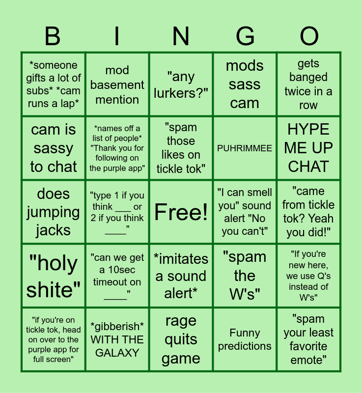 This bingo card has a free space and 24 words: "can we get a 10sec timeout on ____", *gibberish* WITH THE GALAXY, "spam those likes on tickle tok", "if you're on tickle tok, head on over to the purple app for full screen", gets banged twice in a row, *someone gifts a lot of subs* *cam runs a lap*, cam is sassy to chat, mod basement mention, "I can smell you" sound alert "No you can't", *imitates a sound alert*, PUHRIMMEE, does jumping jacks, "spam the W's", "If you're new here, we use Q's instead of W's", *names off a list of people* "Thank you for following on the purple app", Funny predictions, "came from tickle tok? Yeah you did!", "any lurkers?", HYPE ME UP CHAT, "type 1 if you think ___ or 2 if you think ____", "spam your least favorite emote", "holy shite", mods sass cam and rage quits game.