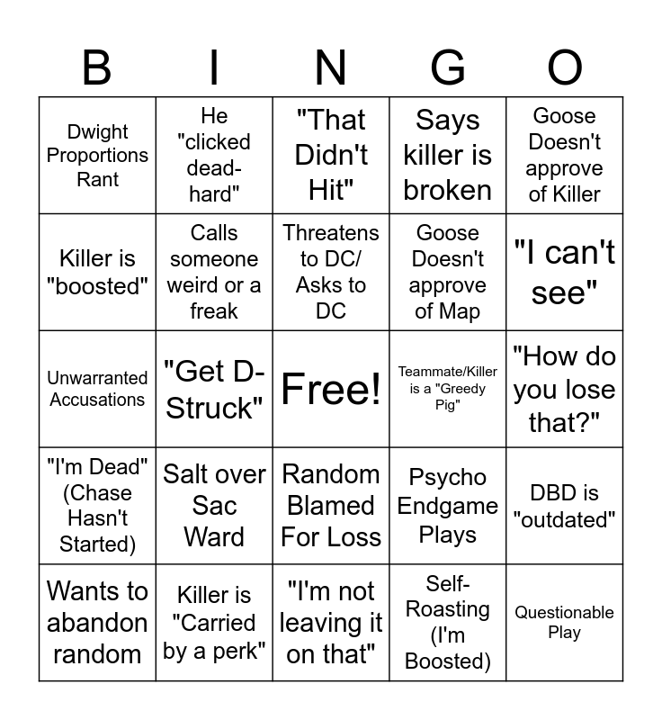 This bingo card has a free space and 24 words: Salt over Sac Ward, Killer is "Carried by a perk", Threatens to DC/ Asks to DC, Wants to abandon random, Goose Doesn't approve of Killer, Dwight Proportions Rant, Killer is "boosted", He "clicked dead-hard", Teammate/Killer is a "Greedy Pig", Random Blamed For Loss, Goose Doesn't approve of Map, Unwarranted Accusations, Psycho Endgame Plays, DBD is "outdated", Calls someone weird or a freak, Self-Roasting (I'm Boosted), "How do you lose that?", "That Didn't Hit", "I can't see", "Get D-Struck", Questionable Play, "I'm Dead" (Chase Hasn't Started), Says killer is broken and "I'm not leaving it on that".