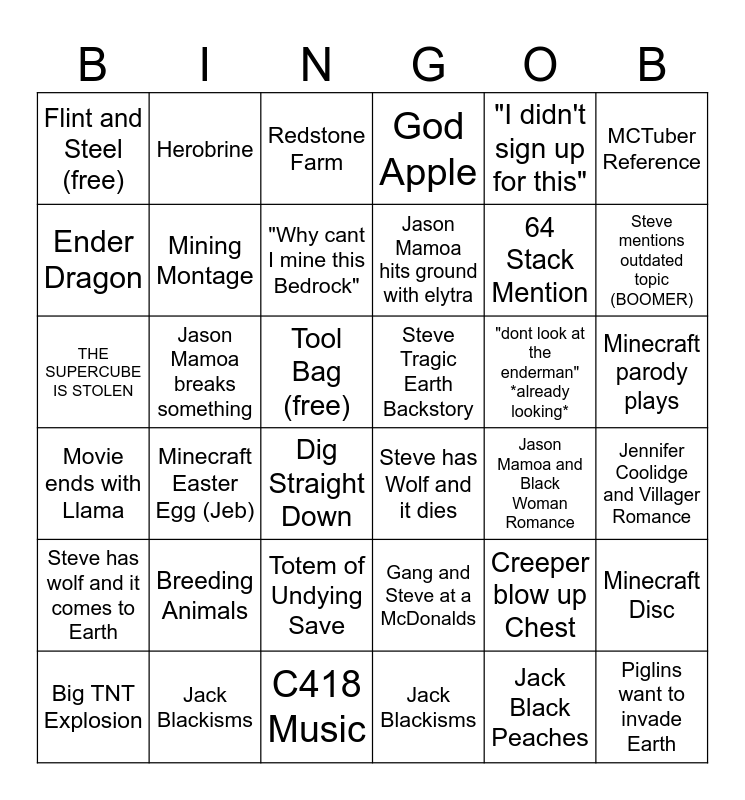 This bingo card has 36 words: Gang and Steve at a McDonalds, Totem of Undying Save, Jack Blackisms, Ender Dragon, Movie ends with Llama, Steve Tragic Earth Backstory, Mining Montage, C418 Music, "I didn't sign up for this", Creeper blow up Chest, Steve mentions outdated topic (BOOMER), God Apple, Minecraft Disc, Jason Mamoa breaks something, Jason Mamoa hits ground with elytra, Flint and Steel (free), Steve has wolf and it comes to Earth, "dont look at the enderman" *already looking*, THE SUPERCUBE IS STOLEN, Redstone Farm, Tool Bag (free), Minecraft Easter Egg (Jeb), Steve has Wolf and it dies, Dig Straight Down, Jason Mamoa and Black Woman Romance, Herobrine, 64 Stack Mention, Jack Blackisms, "Why cant I mine this Bedrock", MCTuber Reference, Piglins want to invade Earth, Big TNT Explosion, Jennifer Coolidge and Villager Romance, Minecraft parody plays, Breeding Animals and Jack Black Peaches.