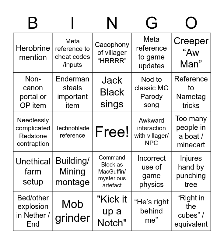 This bingo card has a free space and 29 words: C418 song, Mob grinder, Cacophony of villager “HRRRR”, Power of Friendship, Creeper “Aw Man”, Herobrine mention, Enderman steals important item, Jack Black sings, Awkward interaction with villager/ NPC, Injures hand by punching tree, Bed/other explosion in Nether / End, Technoblade reference, “He’s right behind me”, “Right in the cubes” / equivalent, Needlessly complicated Redstone contraption, Set off TNT trap, "Kick it up a Notch", Incorrect use of game physics, Reference to Nametag tricks, Unethical farm setup, Building/ Mining montage, Voice cameo from MCYT, Nod to classic MC Parody song, Too many people in a boat / minecart, Non-canon portal or OP item, Meta reference to cheat codes /inputs, Command Block as MacGuffin/ mysterious artefact, Meta reference to game updates and Fortnite dance.