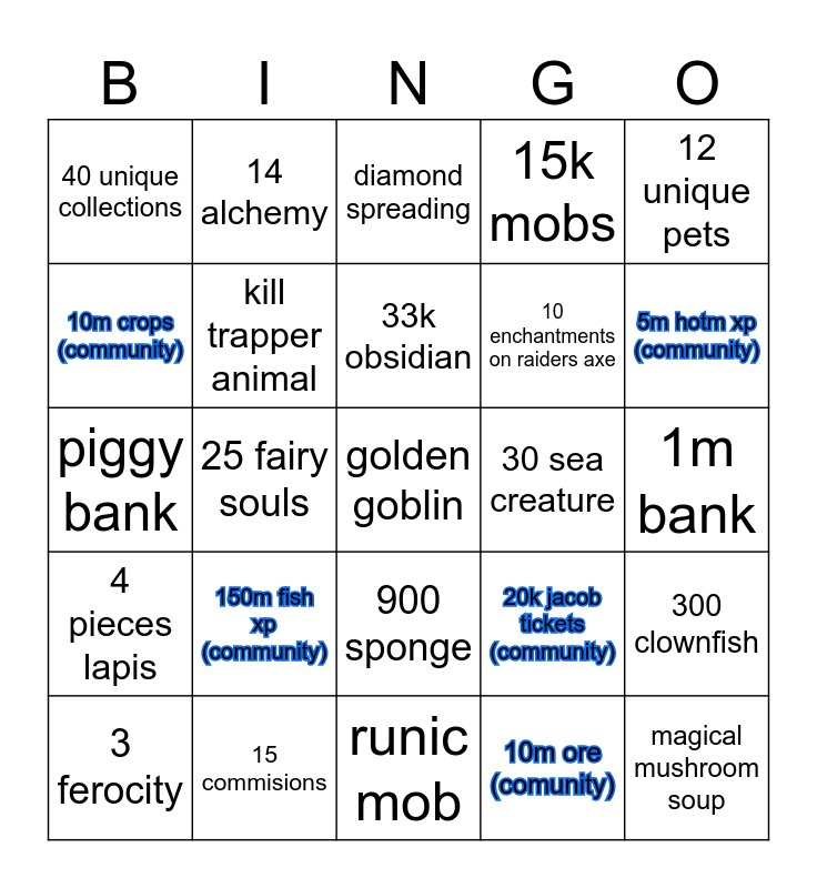 This bingo card has 25 words: 150m fish xp (community), runic mob, 33k obsidian, 3 ferocity, 12 unique pets, 40 unique collections, 10m crops (community), 14 alchemy, 30 sea creature, 900 sponge, 10 enchantments on raiders axe, piggy bank, 20k jacob tickets (community), 300 clownfish, kill trapper animal, magical mushroom soup, 1m bank, diamond spreading, 5m hotm xp (community), 25 fairy souls, golden goblin, 15 commisions, 4 pieces lapis, 15k mobs and 10m ore (comunity).