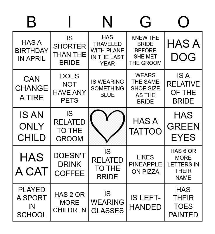 This bingo card has a free space and 24 words: DOESN'T DRINK COFFEE, HAS 2 OR MORE CHILDREN, IS WEARING SOMETHING BLUE, PLAYED A SPORT IN SCHOOL, HAS A DOG, HAS A BIRTHDAY IN APRIL, CAN CHANGE A TIRE, IS SHORTER THAN THE BRIDE, HAS A TATTOO, IS RELATED TO THE BRIDE, WEARS THE SAME SHOE SIZE AS THE BRIDE, IS AN ONLY CHILD, LIKES PINEAPPLE ON PIZZA, HAS 6 OR MORE LETTERS IN THEIR NAME, DOES NOT HAVE ANY PETS, IS LEFT-HANDED, HAS GREEN EYES, HAS TRAVELED WITH PLANE IN THE LAST YEAR, IS A RELATIVE OF THE BRIDE, IS RELATED TO THE GROOM, HAS THEIR TOES PAINTED, HAS A CAT, KNEW THE BRIDE BEFORE SHE MET THE GROOM and IS WEARING GLASSES.