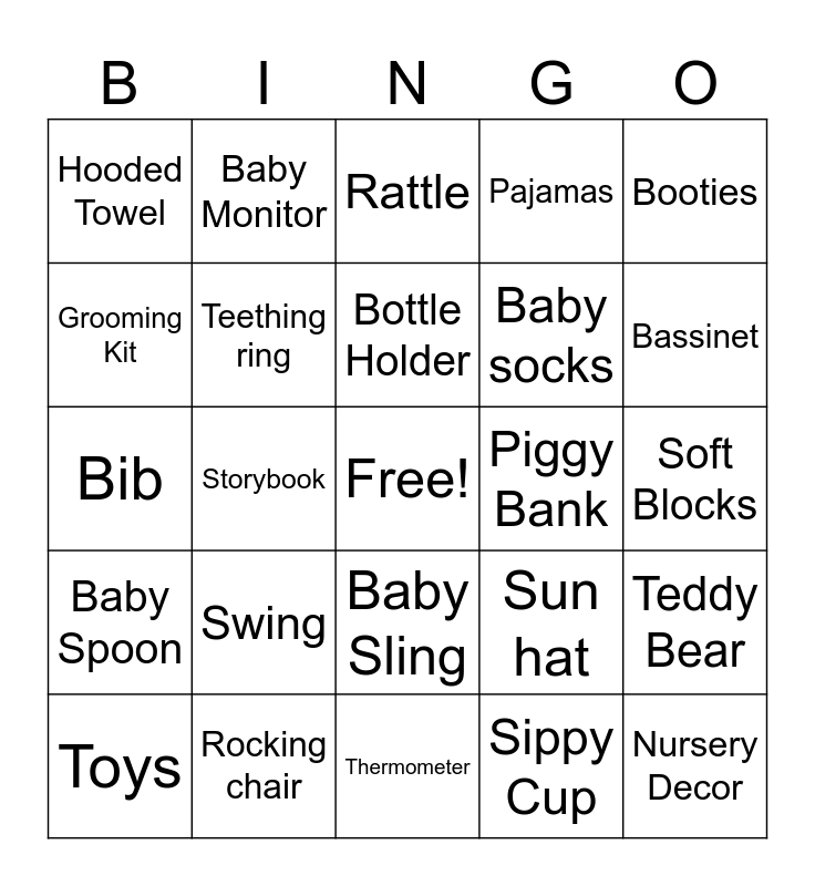 This bingo card has a free space and 40 words: Baby Food, Storybook, Tooth brush, Sun hat, Nursery Decor, Bib, Teething ring, Diapers, Baby socks, Teddy Bear, Hooded Towel, Baby Monitor, Thermometer, Sippy Cup, Soft Blocks, Grooming Kit, Pacifier, Rattle, Bath Lotion, Booties, Baby Spoon, Rocking chair, Bottle Holder, Piggy Bank, Baby Doll, Baby Wipes, Crib, Car Seat, Play Mat, Walkers, Mittens, Swing, Baby Sling, Jumper, Bassinet, Toys, Swaddle Wrap, Milk bottle, Pajamas and Baby Blanket.