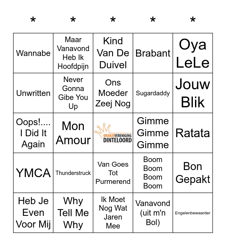 This bingo card has a free space and 81 words: Single Ladies (Put A Ring On It), Kleine Jongen, Kind Van De Duivel, Ich Bin Wie Du, Zoet, Zout, Zuur, Livin' On A Prayer, I Will Survive, I Was Made For Lovin' You, Huisfeestje, Deurdonderen, Dans Je De Hele Nacht Met Mij, Daddy Cool, Brabant, Wannabe, Van Brabant naar Bordeaux, Unwritten, Una Aploma Blanca, Thunderstruck, The Final Countdown, Ratata, Poei Poei, Oya LeLe, Oops!.... I Did It Again, Ons Moeder Zeej Nog, Never Gonna Gibe You Up, Lov U More, Liever Te Dik In De Kist, Liberte, Kali, Juffrouw Toos, Jouw Blik, In De Blote Kont, Ik Moet Nog Wat Jaren Mee, Helikopter, Heb Je Even Voor Mij, Gimme Gimme Gimme, Get Ready, Everybody, Even Aan Mijn Moeder Vragen, Europapa, Engelenbewaarder, Dreams (will Come Alive), De Toreador, Waterloo, Mon Amour, Mama Laudaaa, Maar Vanavond Heb Ik Hoofdpijn, Love Me Just A Little Bit More, De Clown, Dat Interesseert Me Echt Geen Ene Reet, Boom Boom Boom Boom, Bon Gepakt, Blikkendag, Barbie Girl, Bad Romance, Atje Voor De Sfeer, Atemlos Durch Die Nacht, Amalia, Als De Zon Schijnt, Aan de Amsterdamse Grachten, Van Goes Tot Purmerend, Tarzan Boy, Take Me Home, Country Roads, Sweet Caroline, Summer Of '69, Sexy Als Ik Dans, Schudden, Rititi, Rio, Rhythm Is A Dancer, You're The Greatest Lover, YMCA, Why Tell Me Why, Wake Me Up Before You GoGo, Vlieg Met Me Mee, Vier Zomers Lang, Vette Boeren, Vanavond (uit m'n Bol), Terug In De tijd, Sugardaddy and Sterrenstof.