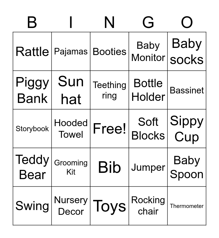 This bingo card has a free space and 40 words: Baby Food, Storybook, Tooth brush, Sun hat, Nursery Decor, Bib, Teething ring, Diapers, Baby socks, Teddy Bear, Hooded Towel, Baby Monitor, Thermometer, Sippy Cup, Soft Blocks, Grooming Kit, Pacifier, Rattle, Bath Lotion, Booties, Baby Spoon, Rocking chair, Bottle Holder, Piggy Bank, Baby Doll, Baby Wipes, Crib, Car Seat, Play Mat, Walkers, Mittens, Swing, Baby Sling, Jumper, Bassinet, Toys, Swaddle Wrap, Milk bottle, Pajamas and Baby Blanket.
