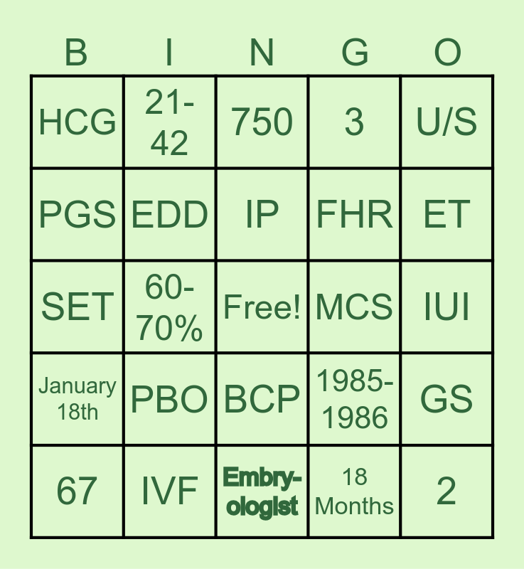 This bingo card has a free space and 24 words: PBO, IVF, IP, 67, U/S, HCG, PGS, 21-42, MCS, BCP, FHR, SET, 1985-1986, GS, EDD, 18 Months, IUI, 750, ET, 60-70%, 2, January 18th, 3 and Embry-ologist.