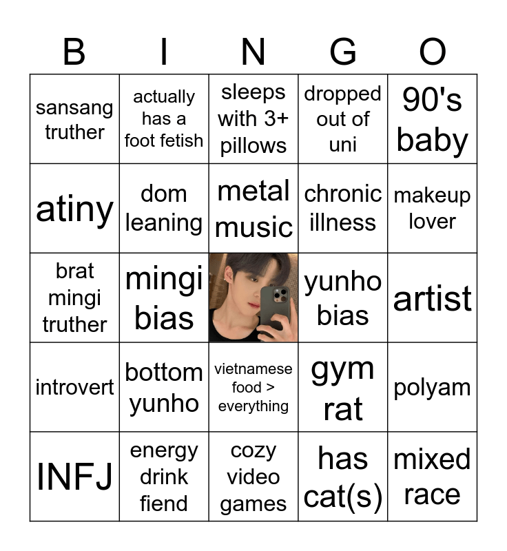 This bingo card has a free space and 24 words: bottom yunho, energy drink fiend, metal music, INFJ, 90's baby, sansang truther, atiny, actually has a foot fetish, yunho bias, vietnamese food > everything, chronic illness, brat mingi truther, gym rat, polyam, dom leaning, has cat(s), artist, sleeps with 3+ pillows, makeup lover, mingi bias, mixed race, introvert, dropped out of uni and cozy video games.
