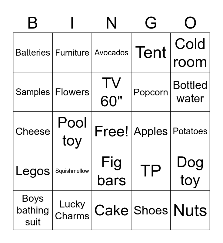 This bingo card has a free space and 24 words: Squishmellow, Lucky Charms, TV 60", Boys bathing suit, Cold room, Batteries, Samples, Furniture, Apples, Fig bars, Popcorn, Cheese, TP, Dog toy, Flowers, Shoes, Potatoes, Avocados, Bottled water, Pool toy, Nuts, Legos, Tent and Cake.