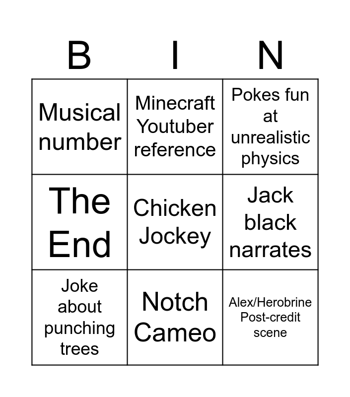 This bingo card has a free space and 8 words: Jack black narrates, Pokes fun at unrealistic physics, Minecraft Youtuber reference, Joke about punching trees, Musical number, Alex/Herobrine Post-credit scene, The End and Notch Cameo.
