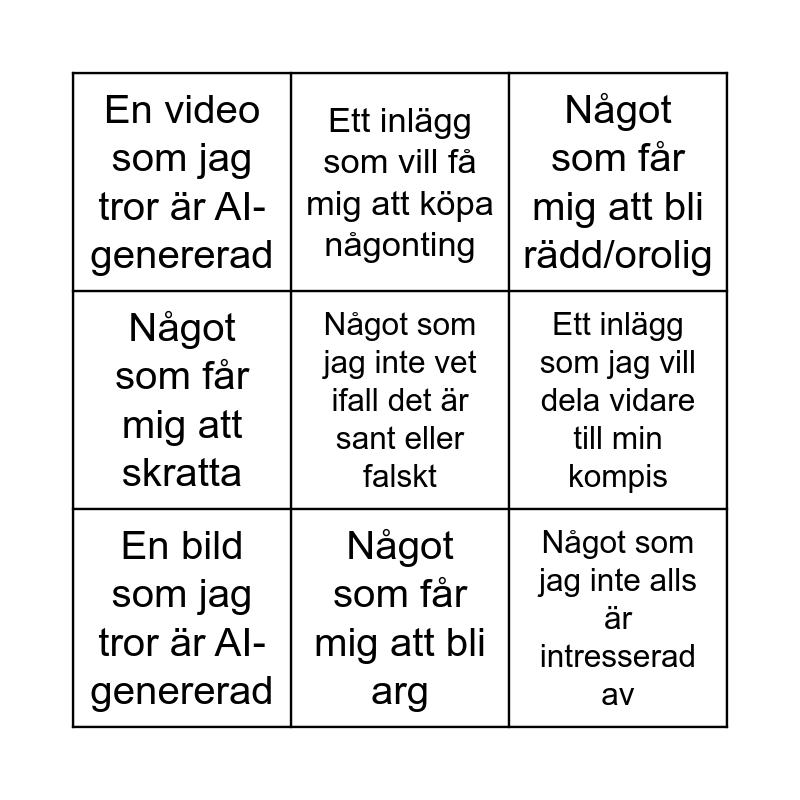 This bingo card has 9 words: En bild som jag tror är AI-genererad, Något som får mig att bli rädd/orolig, Ett inlägg som vill få mig att köpa någonting, Något som får mig att skratta, En video som jag tror är AI-genererad, Ett inlägg som jag vill dela vidare till min kompis, Något som jag inte vet ifall det är sant eller falskt, Något som jag inte alls är intresserad av and Något som får mig att bli arg.