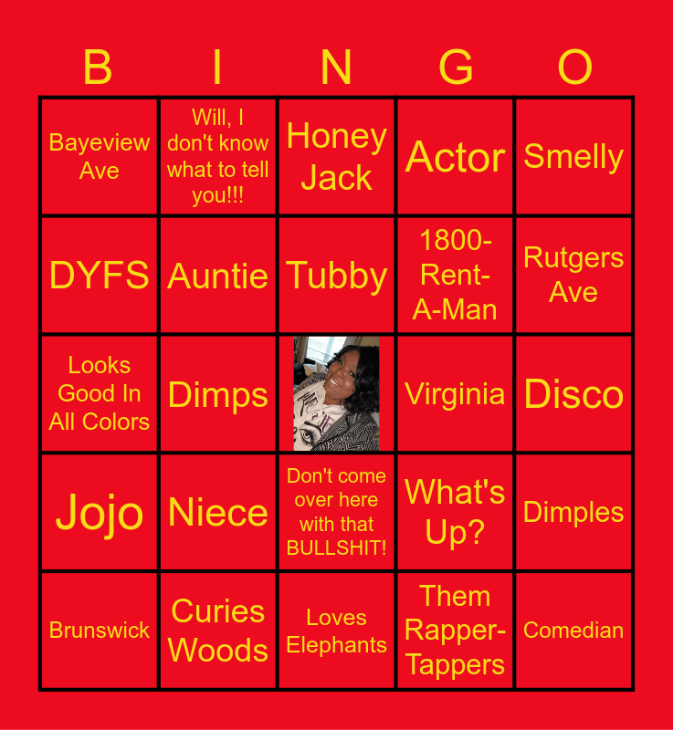 This bingo card has a free space and 38 words: AARP, Shingles, 35 Again, Auntie, Dimples, Niece, Tubby, Menace, Smelly, 1800- Rent-A-Man, Dimps, Actor, Comedian, Disco, DYFS, Jojo, Bayonne, Honey Jack, Salem Court, Virginia, Bayeview Ave, Curies Woods, Rutgers Ave, Brunswick, Hates Cats, Loves Elephants, Loves Music, Can Cook, Enjoys Decorating, I gotta go let my fat out, Hey Girl!!!, Don't come over here with that BULLSHIT!, Them Rapper-Tappers, Will, I don't know what to tell you!!!, Who This???, What's Up?, Looks Good In All Colors and Spending Time With Family and Friends.