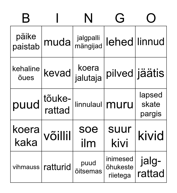 This bingo card has a free space and 24 words: võillil, ratturid, koera jalutaja, vihmauss, linnud, päike paistab, kehaline õues, muda, muru, soe ilm, pilved, puud, suur kivi, kivid, kevad, inimesed õhukeste riietega, lapsed skate pargis, jalgpalli mängijad, jäätis, tõuke-rattad, jalg-rattad, koera kaka, lehed and puud õitsemas.