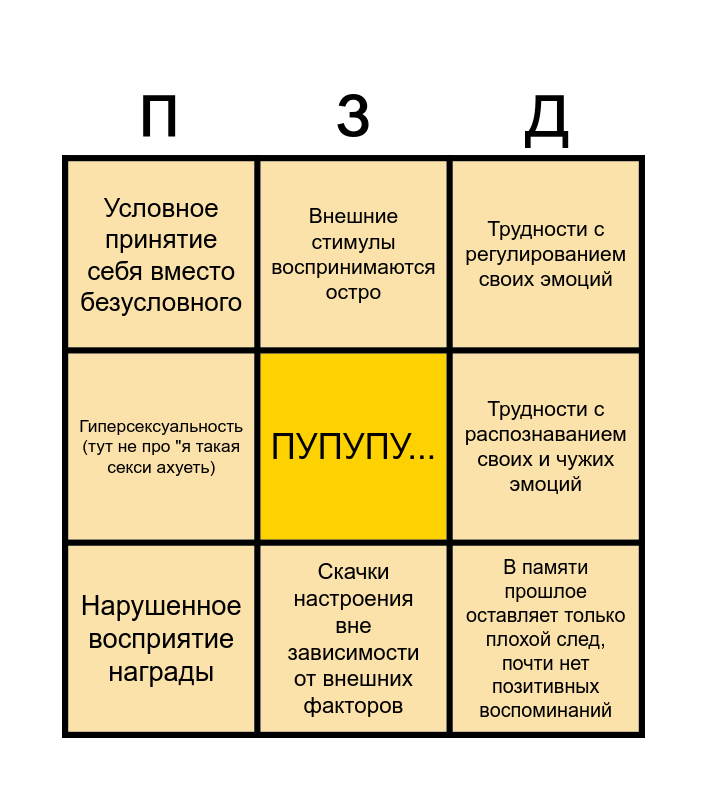 This bingo card has a free space and 8 words: Трудности с распознаванием своих и чужих эмоций, Трудности с регулированием своих эмоций, Внешние стимулы воспринимаются остро, Нарушенное восприятие награды, Условное принятие себя вместо безусловного, В памяти прошлое оставляет только плохой след, почти нет позитивных воспоминаний, Гиперсексуальность (тут не про "я такая секси ахуеть) and Скачки настроения вне зависимости от внешних факторов.