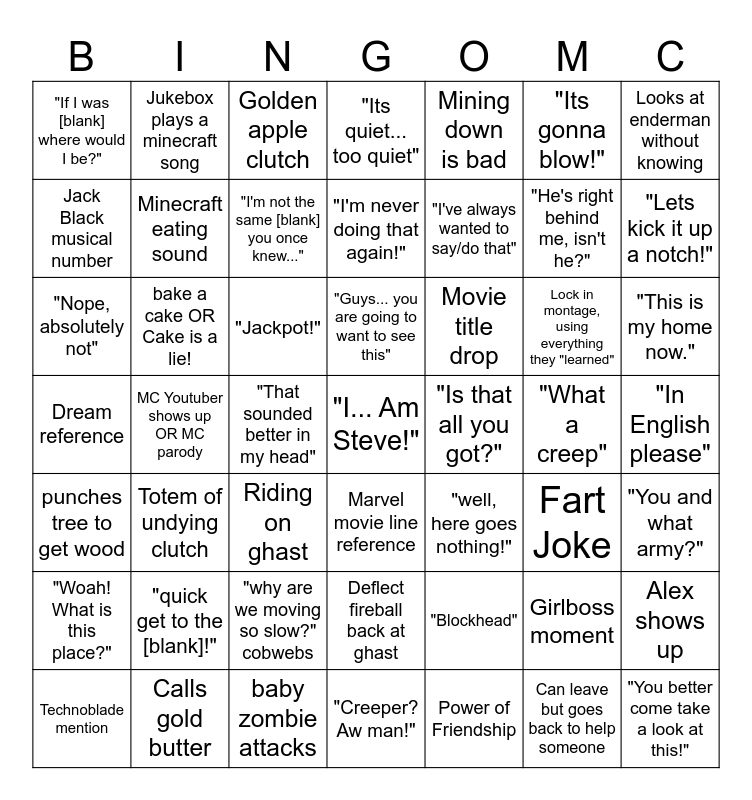 This bingo card has a free space and 48 words: "Blockhead", "He's right behind me, isn't he?", "Creeper? Aw man!", MC Youtuber shows up OR MC parody, "Jackpot!", "In English please", Jukebox plays a minecraft song, Calls gold butter, "Its gonna blow!", Marvel movie line reference, Looks at enderman without knowing, "Its quiet... too quiet", Lock in montage, using everything they "learned", Movie title drop, "Woah! What is this place?", "What a creep", Jack Black musical number, "Lets kick it up a notch!", Girlboss moment, Mining down is bad, "I've always wanted to say/do that", "That sounded better in my head", "If I was [blank] where would I be?", Minecraft eating sound, Alex shows up, "I'm not the same [blank] you once knew...", "This is my home now.", Technoblade mention, "Guys... you are going to want to see this", bake a cake OR Cake is a lie!, Can leave but goes back to help someone, "Is that all you got?", "You and what army?", "quick get to the [blank]!", Dream reference, "well, here goes nothing!", Fart Joke, "Nope, absolutely not", Riding on ghast, "why are we moving so slow?" cobwebs, punches tree to get wood, "You better come take a look at this!", Golden apple clutch, baby zombie attacks, "I'm never doing that again!", Deflect fireball back at ghast, Totem of undying clutch and Power of Friendship.