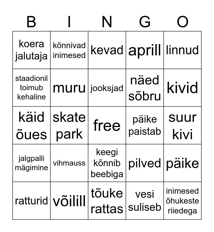 This bingo card has a free space and 24 words: vihmauss, võilill, jooksjad, ratturid, linnud, koera jalutaja, staadionil toimub kehaline, kõnnivad inimesed, päike paistab, keegi kõnnib beebiga, näed sõbru, käid õues, pilved, päike, muru, vesi suliseb, suur kivi, kevad, kivid, skate park, inimesed õhukeste riiedega, jalgpalli mägimine, aprill and tõuke rattas.