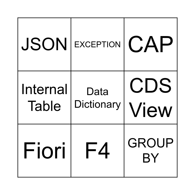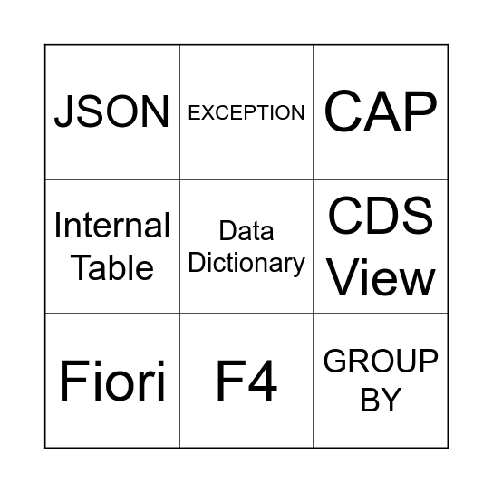 This bingo card has 30 words: ABAP, BTP, HANA Database, OData Service, JSON, CAP, Fiori, SE80, SAP Gateway, Data Migration, Smart Forms, RAP, SAP SuccessFactors, SAP Ariba, SU01, ECC, SAP GUI, SAP Joule, SAP CoPilot, Data Dictionary, BADI, Inner Join, EXCEPTION, GROUP BY, CDS View, Internal Table, ASSOCIATION, SE11, F4 and SE37.