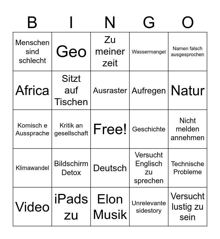 This bingo card has a free space and 24 words: Bildschirm Detox, iPads zu, Ausraster, Video, Namen falsch ausgesprochen, Menschen sind schlecht, Africa, Geo, Geschichte, Deutsch, Aufregen, Komisch e Aussprache, Versucht Englisch zu sprechen, Technische Probleme, Sitzt auf Tischen, Unrelevante sidestory, Nicht melden annehmen, Zu meiner zeit, Natur, Kritik an gesellschaft, Versucht lustig zu sein, Klimawandel, Wassermangel and Elon Musik.
