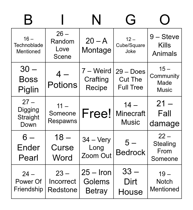 This bingo card has a free space and 36 words: 1 – Alex, 2 – Youtuber Cameo, 3 – Animal Sidekick, 4 – Potions, 5 – Bedrock, 6 – Ender Pearl, 7 – Weird Crafting Recipe, 8 – Piglins Invade Earth, 9 – Steve Kills Animals, 10 – Jeb Mentioned, 11 – Someone Respawns, 12 – Cube/Square Joke, 13 – Steve In Overworld, 14 – Minecraft Music, 15 – Community Made Music, 16 – Technoblade Mentioned, 17 – The End, 18 – Curse Word, 19 – Notch Mentioned, 20 – A Montage, 21 – Fall damage, 22 – Stealing From Someone, 23 – Incorrect Redstone, 24 – Power Of Friendship, 25 – Iron Golems Betray, 26 – Random Love Scene, 27 – Digging Straight Down, 28 – Doesn't Cut The Full Tree, 29 – Does Cut The Full Tree, 30 – Boss Piglin, 31 – Friendly Piglin, 32 – <5 Minecraft Structures, 33 – Dirt House, 34 – Very Long Zoom Out, 35 – Blue Glowing Cube Stupid and 36 – The Armour Is Heavy.