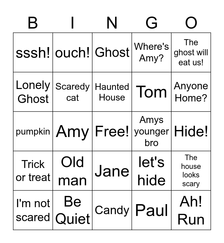 This bingo card has a free space and 24 words: Old man, Be Quiet, Haunted House, I'm not scared, The ghost will eat us!, sssh!, Lonely Ghost, ouch!, Amys younger bro, Jane, Tom, pumpkin, let's hide, The house looks scary, Scaredy cat, Paul, Hide!, Ghost, Anyone Home?, Amy, Ah! Run, Trick or treat, Where's Amy? and Candy.