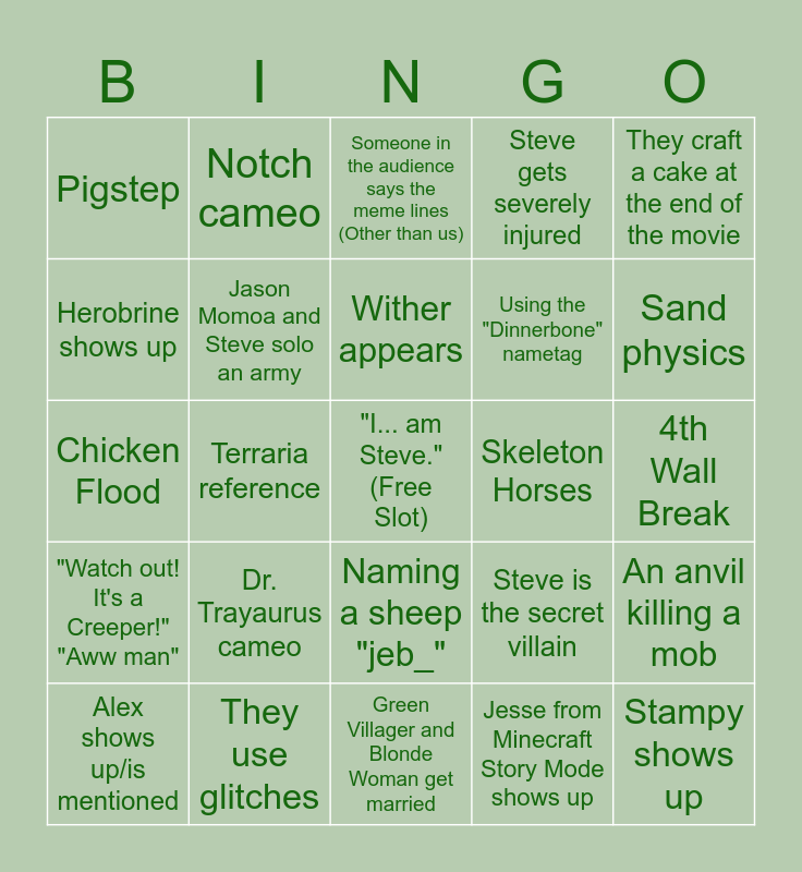 This bingo card has a free space and 24 words: Dr. Trayaurus cameo, They use glitches, Wither appears, Alex shows up/is mentioned, They craft a cake at the end of the movie, Pigstep, Herobrine shows up, Notch cameo, Skeleton Horses, Naming a sheep "jeb_", Using the "Dinnerbone" nametag, Chicken Flood, Steve is the secret villain, An anvil killing a mob, Jason Momoa and Steve solo an army, Jesse from Minecraft Story Mode shows up, 4th Wall Break, Someone in the audience says the meme lines (Other than us), Sand physics, Terraria reference, Stampy shows up, "Watch out! It's a Creeper!" "Aww man", Steve gets severely injured and Green Villager and Blonde Woman get married.