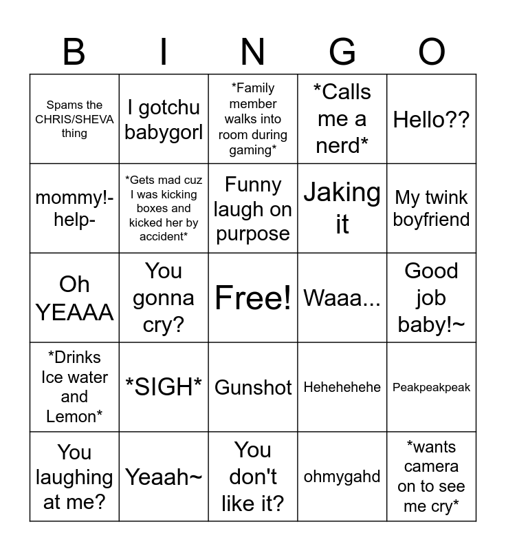 This bingo card has a free space and 24 words: *SIGH*, Yeaah~, Funny laugh on purpose, You laughing at me?, Hello??, Spams the CHRIS/SHEVA thing, mommy!- help-, I gotchu babygorl, Waaa..., Gunshot, Jaking it, Oh YEAAA, Hehehehehe, Peakpeakpeak, *Gets mad cuz I was kicking boxes and kicked her by accident*, ohmygahd, Good job baby!~, *Family member walks into room during gaming*, My twink boyfriend, You gonna cry?, *wants camera on to see me cry*, *Drinks Ice water and Lemon*, *Calls me a nerd* and You don't like it?.