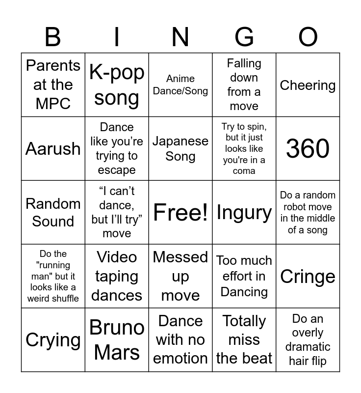 This bingo card has a free space and 24 words: Video taping dances, Bruno Mars, Japanese Song, Crying, Cheering, Parents at the MPC, Aarush, K-pop song, Ingury, Messed up move, Try to spin, but it just looks like you're in a coma, Random Sound, Too much effort in Dancing, Cringe, Dance like you’re trying to escape, Totally miss the beat, Do a random robot move in the middle of a song, Anime Dance/Song, 360, “I can’t dance, but I’ll try” move, Do an overly dramatic hair flip, Do the "running man" but it looks like a weird shuffle, Falling down from a move and Dance with no emotion.