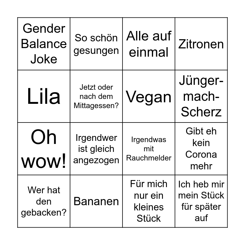 This bingo card has 16 words: Bananen, Gibt eh kein Corona mehr, Alle auf einmal, Gender Balance Joke, Oh wow!, So schön gesungen, Irgendwas mit Rauchmelder, Für mich nur ein kleines Stück, Lila, Jetzt oder nach dem Mittagessen?, Wer hat den gebacken?, Zitronen, Irgendwer ist gleich angezogen, Jünger-mach-Scherz, Vegan and Ich heb mir mein Stück für später auf.