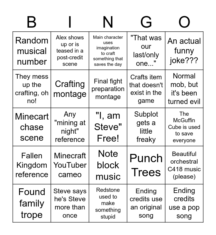 This bingo card has a free space and 30 words: Steve says he's Steve more than once, Aw man, Any "mining at night" reference, "It's gonna blow!", Random musical number, Main character uses imagination to craft something that saves the day, Crafting montage, Note block music, Subplot gets a little freaky, Redstone used to make something stupid, The McGuffin Cube is used to save everyone, Ending credits use a pop song, Ending credits use an original song, Any cube, square, or block pun, Normal mob, but it's been turned evil, "I guess this [scenario] is happening now!", Punch Trees, Fallen Kingdom reference, Minecraft YouTuber cameo, An actual funny joke???, Minecart chase scene, School troubles (being a kid SUCKS!!!), Alex shows up or is teased in a post-credit scene, Crafts item that doesn't exist in the game, They mess up the crafting, oh no!, "That was our last/only one...", Beautiful orchestral C418 music (please), Found family trope, Final fight preparation montage and Herobrine cameo.