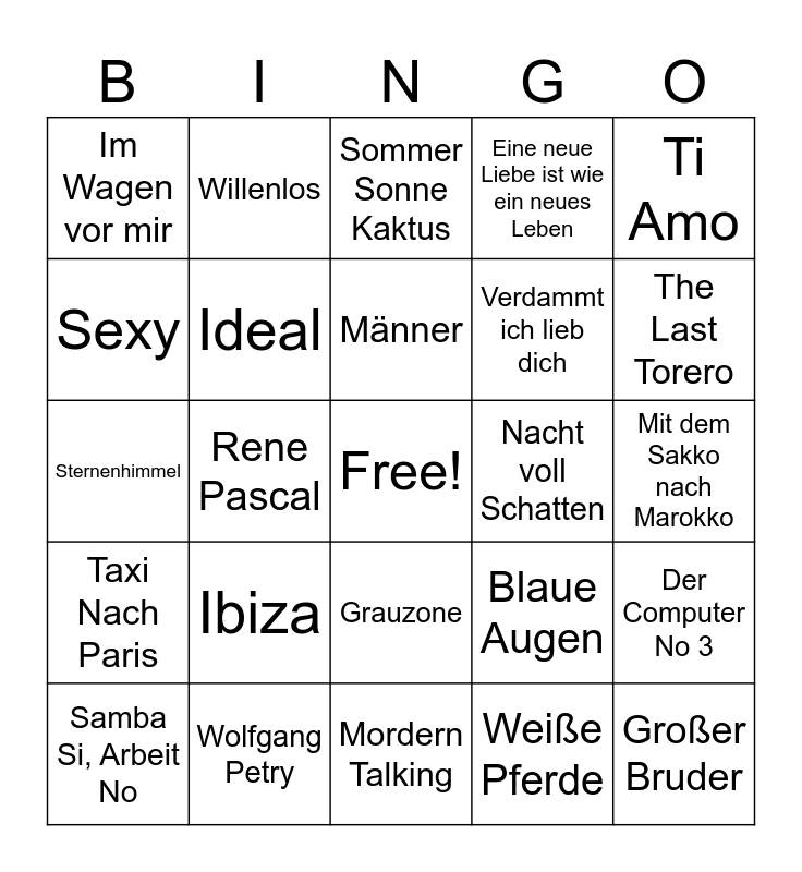 This bingo card has a free space and 24 words: Ibiza, Wolfgang Petry, Männer, Samba Si, Arbeit No, Ti Amo, Im Wagen vor mir, Sexy, Willenlos, Nacht voll Schatten, Grauzone, Verdammt ich lieb dich, Sternenhimmel, Blaue Augen, Der Computer No 3, Ideal, Weiße Pferde, Mit dem Sakko nach Marokko, Sommer Sonne Kaktus, The Last Torero, Rene Pascal, Großer Bruder, Taxi Nach Paris, Eine neue Liebe ist wie ein neues Leben and Mordern Talking.