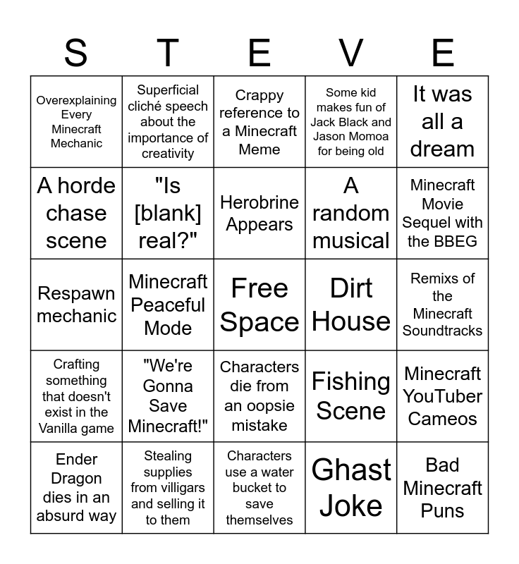 This bingo card has a free space and 24 words: "We're Gonna Save Minecraft!", Stealing supplies from villigars and selling it to them, Herobrine Appears, Ender Dragon dies in an absurd way, It was all a dream, Overexplaining Every Minecraft Mechanic, A horde chase scene, Superficial cliché speech about the importance of creativity, Dirt House, Characters die from an oopsie mistake, A random musical, Respawn mechanic, Fishing Scene, Minecraft YouTuber Cameos, "Is [blank] real?", Ghast Joke, Remixs of the Minecraft Soundtracks, Crappy reference to a Minecraft Meme, Minecraft Movie Sequel with the BBEG, Minecraft Peaceful Mode, Bad Minecraft Puns, Crafting something that doesn't exist in the Vanilla game, Some kid makes fun of Jack Black and Jason Momoa for being old and Characters use a water bucket to save themselves.