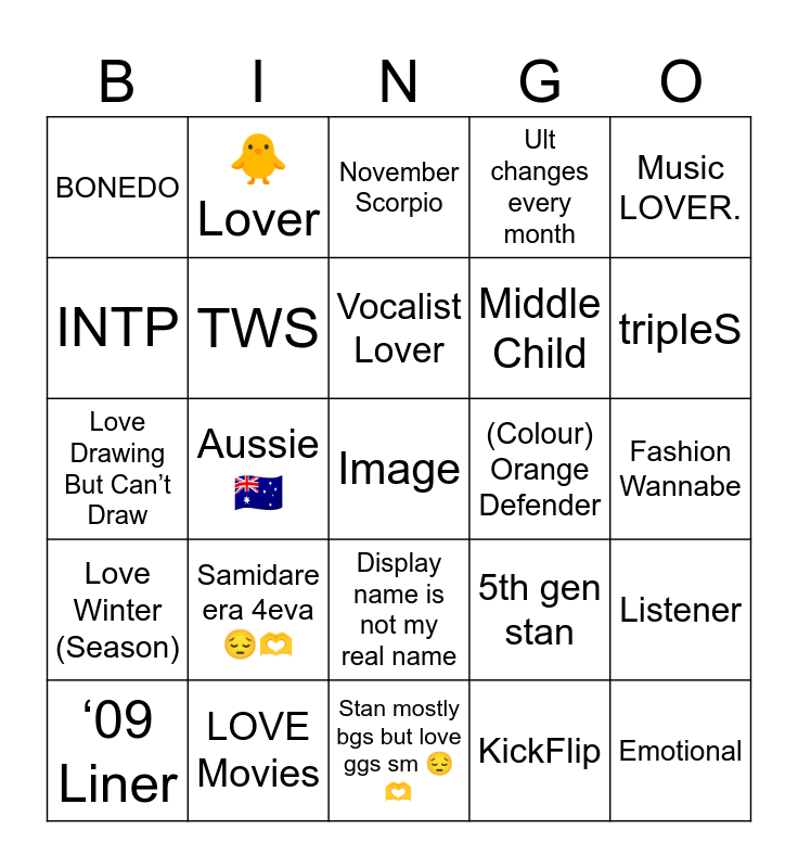 This bingo card has a free space and 24 words: โ09 Liner, Samidare era 4eva ๐๐ซถ, Vocalist Lover, KickFlip, Music LOVER., BONEDO, ๐ฅ Lover, November Scorpio, (Colour) Orange Defender, Fashion Wannabe, Love Drawing But Canโt Draw, TWS, 5th gen stan, Listener, INTP, LOVE Movies, Stan mostly bgs but love ggs sm ๐๐ซถ, Ult changes every month, tripleS, Love Winter (Season), Aussie ๐ฆ๐บ, Display name is not my real name, Middle Child and Emotional.