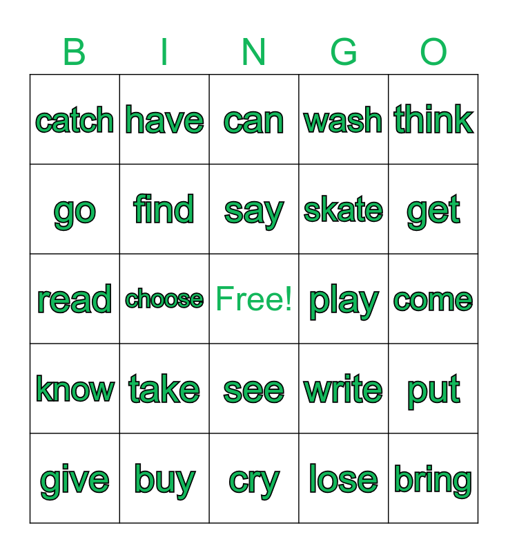 This bingo card has a free space and 24 words: take, buy, say, give, think, catch, go, have, play, see, skate, read, write, put, find, lose, come, can, get, choose, bring, know, wash and cry.