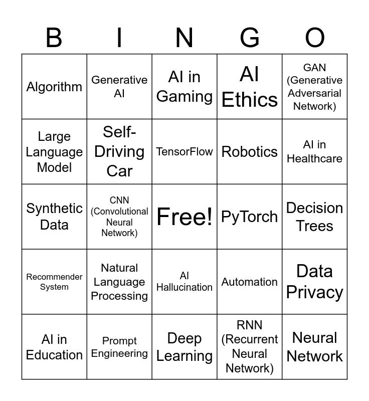 This bingo card has a free space and 50 words: Machine Learning, Neural Network, Artificial Intelligence, Deep Learning, Natural Language Processing, Computer Vision, Generative AI, Chatbot, Large Language Model, Reinforcement Learning, Self-Driving Car, AI Ethics, Data Privacy, Automation, Turing Test, Python, TensorFlow, PyTorch, OpenAI, GAN (Generative Adversarial Network), CNN (Convolutional Neural Network), RNN (Recurrent Neural Network), Algorithm, Robotics, Digital Twin, Smart Assistant, AI in Healthcare, AI in Finance, AI in Gaming, AI Hallucination, AI Regulation, Bias in AI, Data Labeling, AI Governance, Prompt Engineering, Virtual Reality, Augmented Reality, Feature Engineering, Knowledge Graph, Decision Trees, BERT, Transformer Model, AI-generated Music, Explainable AI, AI in Education, Synthetic Data, Speech Recognition, Image Recognition, Recommender System and Sentiment Analysis.