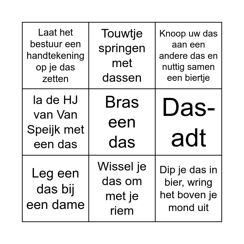 This bingo card has 9 words: Leg een das bij een dame, Knoop uw das aan een andere das en nuttig samen een biertje, Touwtje springen met dassen, la de HJ van Van Speijk met een das, Laat het bestuur een handtekening op je das zetten, Das-adt, Bras een das, Dip je das in bier, wring het boven je mond uit and Wissel je das om met je riem.