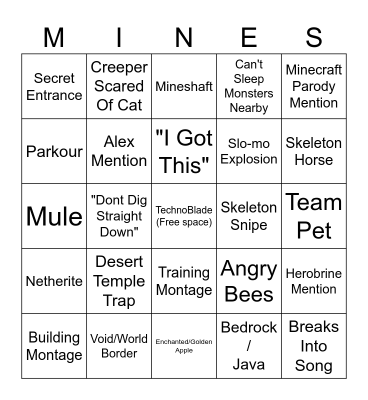 This bingo card has a free space and 39 words: Diamond Minecart, We Are Minecraft, Friends Along The Way, Alex Mention, Building Montage, Training Montage, "I Got This", "He's Right Behind Me Isn't he?", Minecraft Parody Mention, Netherite, "Dont Dig Straight Down", Can't Sleep Monsters Nearby, Breaks Into Song, Team Pet, Skeleton Snipe, Desert Temple Trap, Dancing Parrot, Secret Entrance, Mob Nametag, Angry Bees, Parkour, Enchanted/Golden Apple, Slo-mo Explosion, Skeleton Horse, Never Spend Diamonds On a Hoe, Phantom / Ally, Guardian, Shipwreck / Hidden Treasure, Gold Tool Slander, Creeper Scared Of Cat, Music Disc, Creative Blocks, Mineshaft, Void/World Border, Bedrock / Java, Trying To Break Bedrock, Herobrine Mention, Mule and Vanilla Boss Mention.