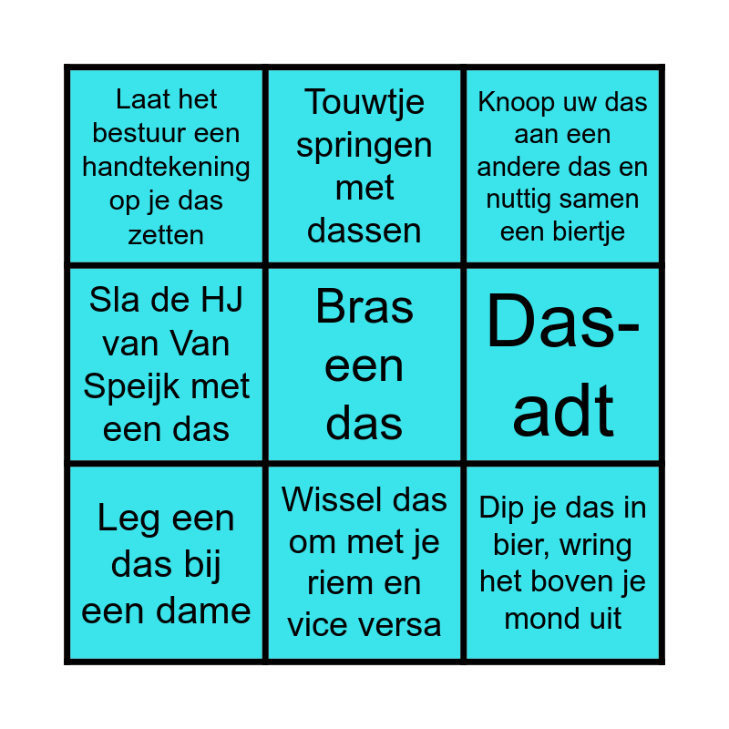 This bingo card has 9 words: Leg een das bij een dame, Knoop uw das aan een andere das en nuttig samen een biertje, Touwtje springen met dassen, Sla de HJ van Van Speijk met een das, Laat het bestuur een handtekening op je das zetten, Das-adt, Bras een das, Dip je das in bier, wring het boven je mond uit and Wissel das om met je riem en vice versa.