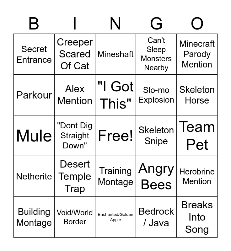 This bingo card has a free space and 39 words: Diamond Minecart, We Are Minecraft, Friends Along The Way, Alex Mention, Building Montage, Training Montage, "I Got This", "He's Right Behind Me Isn't he?", Minecraft Parody Mention, Netherite, "Dont Dig Straight Down", Can't Sleep Monsters Nearby, Breaks Into Song, Team Pet, Skeleton Snipe, Desert Temple Trap, Dancing Parrot, Secret Entrance, Mob Nametag, Angry Bees, Parkour, Enchanted/Golden Apple, Slo-mo Explosion, Skeleton Horse, Never Spend Diamonds On a Hoe, Phantom / Ally, Guardian, Shipwreck / Hidden Treasure, Gold Tool Slander, Creeper Scared Of Cat, Music Disc, Creative Blocks, Mineshaft, Void/World Border, Bedrock / Java, Trying To Break Bedrock, Herobrine Mention, Mule and Vanilla Boss Mention.