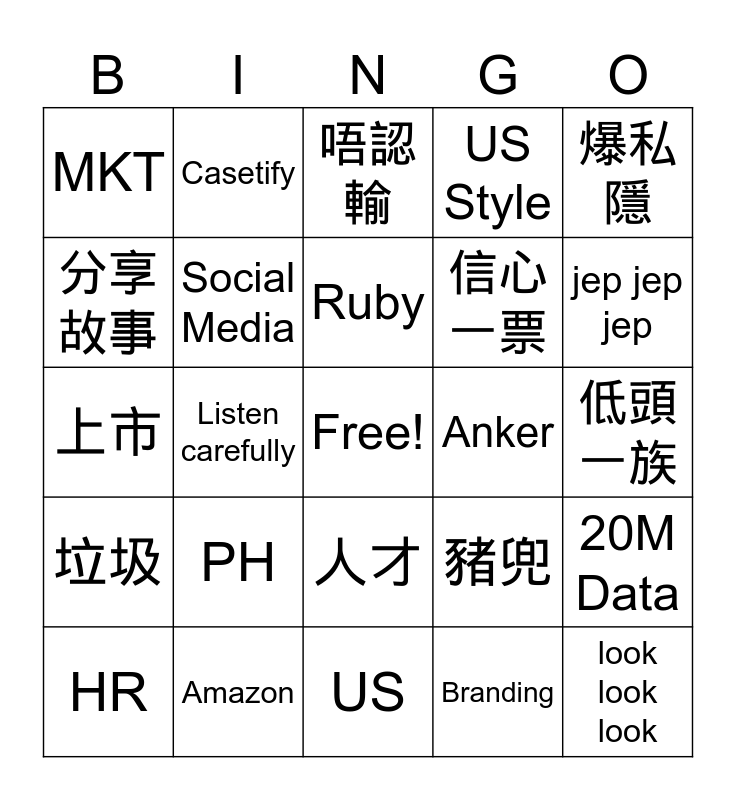 This bingo card has a free space and 25 words: PH, US, Ruby, HR, 爆私隱, MKT, 分享故事, Casetify, Anker, 人才, 信心一票, 上市, 豬兜, 20M Data, Social Media, Lululemon, 低頭一族, 唔認輸, jep jep jep, Listen carefully, look look look, Amazon, 垃圾, US Style and Branding.