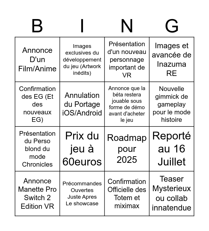 This bingo card has 16 words: Précommandes Ouvertes Juste Apres Le showcase, Reporté au 16 Juillet, Présentation d'un nouveau personnage important de VR, Annonce D'un Film/Anime, Présentation du Perso blond du mode Chronicles, Images exclusives du développement du jeu (Artwork inédits), Roadmap pour 2025, Confirmation Officielle des Totem et miximax, Confirmation des EG (Et des nouveaux EG), Annulation du Portage iOS/Android, Annonce Manette Pro Switch 2 Edition VR, Images et avancée de Inazuma RE, Prix du jeu à 60euros, Nouvelle gimmick de gameplay pour le mode histoire, Annonce que la béta restera jouable sous forme de démo avant d'acheter le jeu and Teaser Mysterieux ou collab innatendue.
