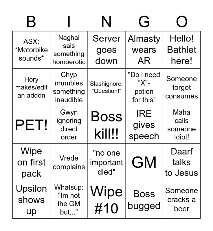 This bingo card has a free space and 37 words: Soulrest stops caring about something, Random IFocus sounds, Asspull, Chyp mumbles something inaudible, Daarf talks to Jesus, Vrede complains, Slashignore: "Question!", Bess fails to move, Hello! Bathlet here!, Twopants lootorgasm, Gwyn ignoring direct order, Almasty wears AR, Someone cracks a beer, Maha calls someone Idiot!, Hory makes/edit an addon, Wipe on first pack, 1 Shot boss, Server goes down, "no one important died", IRE gives speech, ASX: *Motorbike sounds*, Someone forgot consumes, Upsilon shows up, Wipe #10, You get loot, Boss bugged, Naghai sais something homoerotic, Forgot masterloot, "Clear coms", "skill issue", Someone openmics, Whatsup: "Im not the GM but...", PET!, Paladin complaint, GM, "Do i need "X"- potion for this" and Vrograg appears.