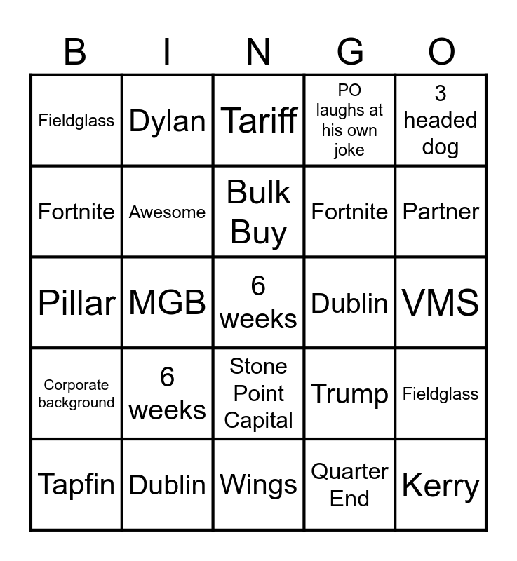 ⚠ This card has duplicate items: Quarter End (2), Tapfin (2), VMS (2), Fieldglass (2), Wings (2), ARR (2), Awesome (2), A dog or small child appears (2), Fortnite (2), Pillar (2), PO laughs at his own joke (2), Corporate background (2), Kerry (2), Butter (2), Dylan (2), 3 headed dog (2), MGB (2), Golden Tenant (2), 6 weeks (2), Dublin (2), Jacksonville (2), Trump (2), Tariff (2), Partner (2), Bulk Buy (2)