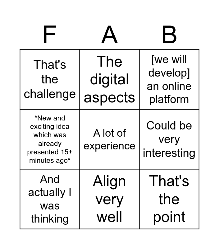 This bingo card has a free space and 8 words: Could be very interesting, [we will develop] an online platform, The digital aspects, And actually I was thinking, That's the challenge, That's the point, *New and exciting idea which was already presented 15+ minutes ago* and Align very well.